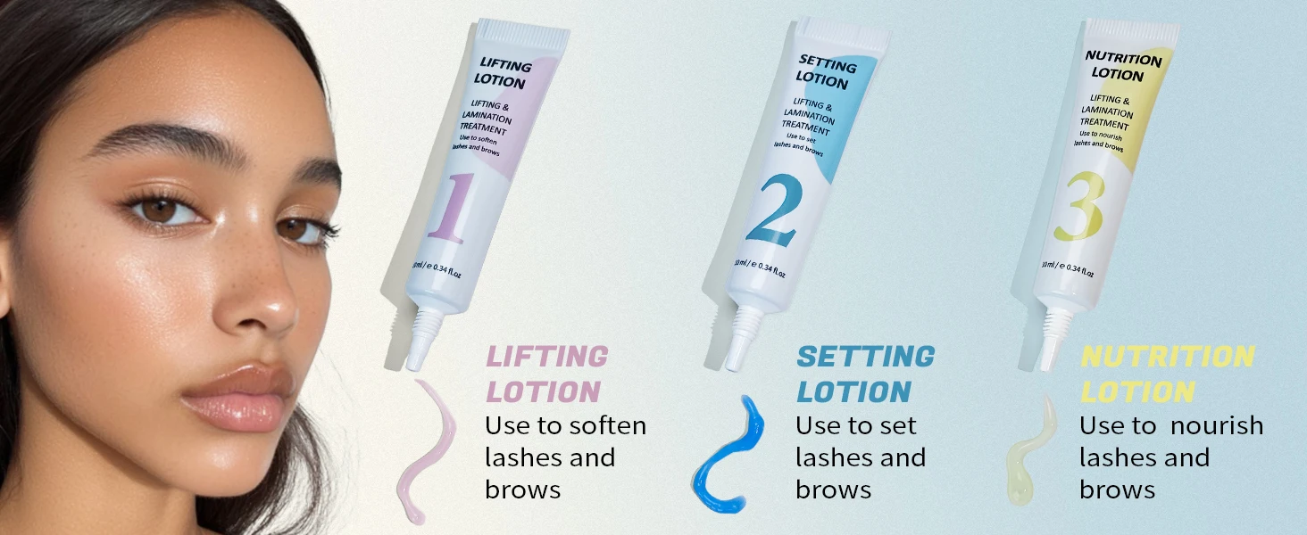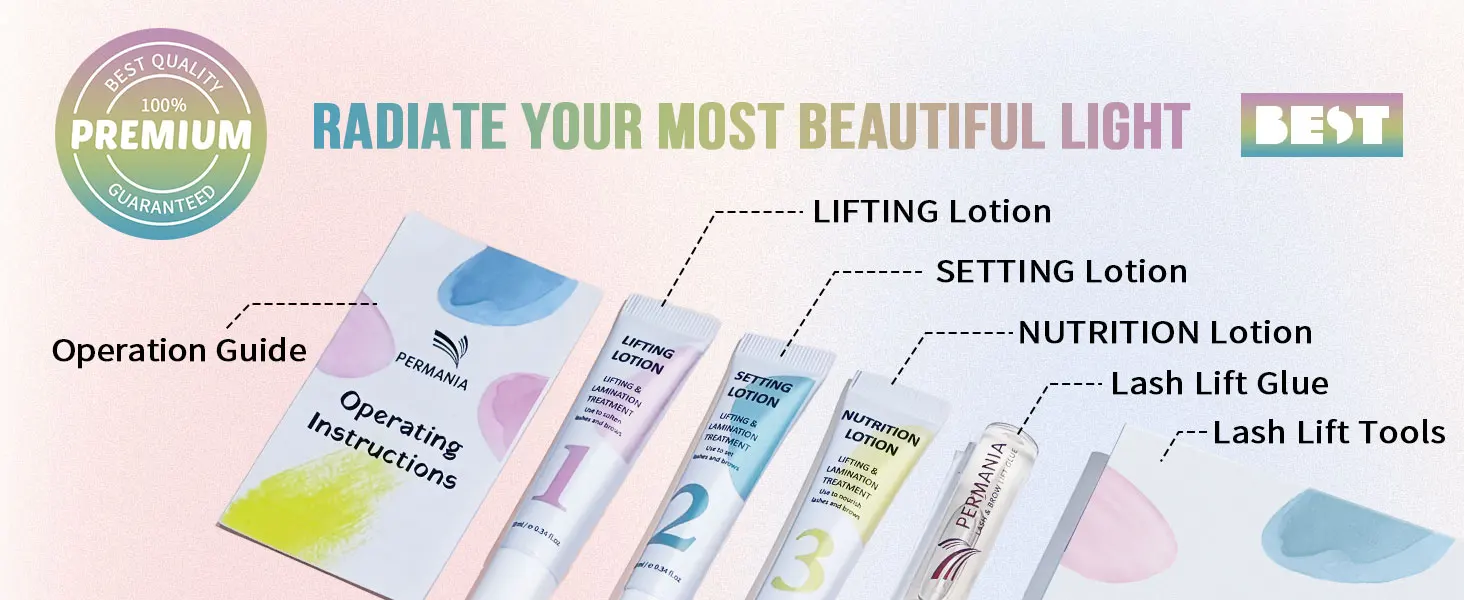 Package Include:Lifting Lotion *1 bottle 5mlSetting Lotion *1 bottle 5mlNutrition Lotion *1 bottle 5mlLash Lift Glue *1 bottle 7mlCOTTON BUD *6 piecesMASCARA BRUSH *6 piecesAPPLICATOR BRUSH *6 piecesY Comb Brush *3Clean brush*2piecesEYE PATCH *3 pairsLASH LIFT SHIELDS *10 pieceUser Manual *1 piecesHow To Use: 1. Firstly, clean up any cosmetic residue, oil on your eyes.2. Apply lash Lift glue to the silicone pads and stick it on your eyes. Then apple some glue one pads and stick your lashes on it.3. Apply LIFTING LOTION to the lashes, wait for 8-10 mins then remove it.4. Apply SETTING LOTION to the lashes, wait for 8-10 mins then remove it.5. Clean off all residue lotion and apply NUTRITION LOTION to the lashes.6. Finally, you'll get beautifully curled lashes!